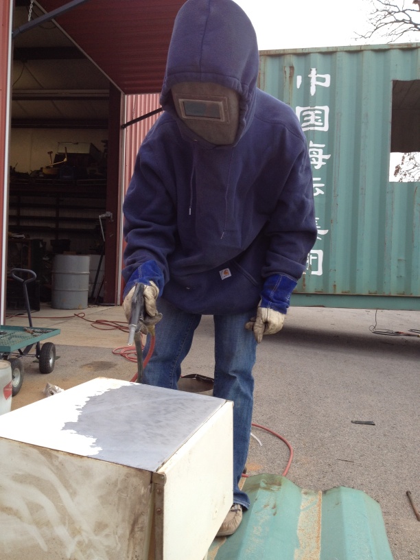 Tyler and his dad Kent, added lights and a exhaust fan to our sandblasting/painting container, making the process a little less horrible. Plus, it not only helps keep me warm on cold winter nights, it also gives me a nice golden tan.