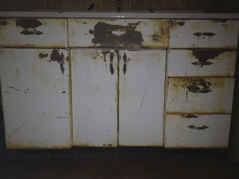 In order to refurbish the cabinets, they must first be sandblasted, which I am currently working on. Next, they will be primed and painted (which we plan on doing ourselves), and the cabinet hardware will be re-chromed. There are original stickers on the inside of the cabinet doors, but they are going to be hard to salvage during the sand-blasting process. Instead, Tyler is going to recreate them and have them printed. Here are pictures of the first cabinet I sandblasted, before I realized I needed different work clothes and a better work space: