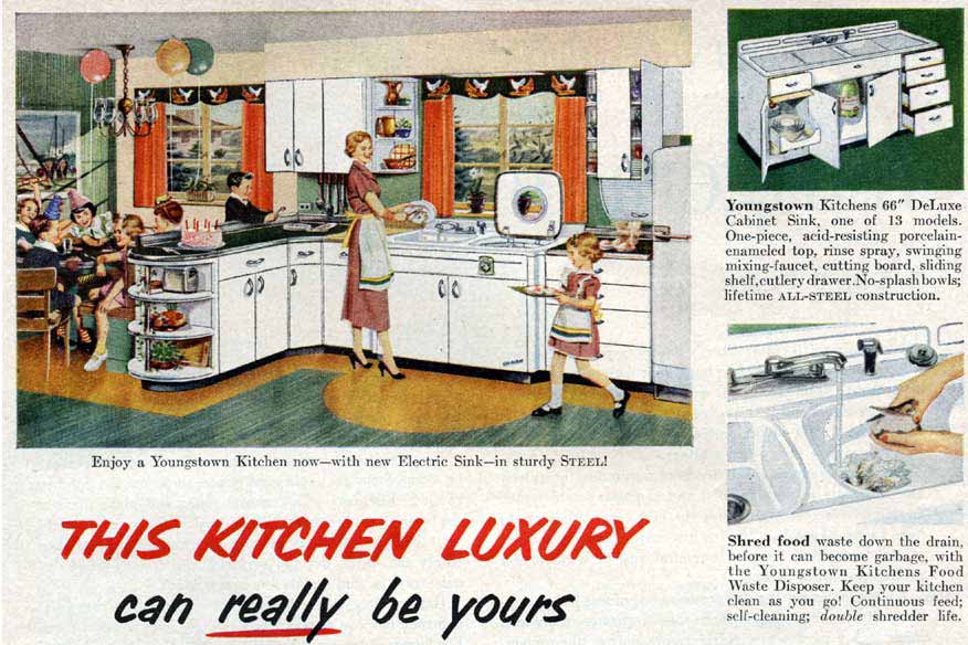 Tyler and I purchased them from a couple in Stillwater. The cabinets had come out of some old apartments located above a post office in downtown Stillwater. We scored 3 sinks, 6 base cabinets, and numerous large and small upper cabinets. Tyler’s mom, Sheilah, utilized one of the sinks in their party barn, and the other two will be installed into our home. One will be placed in the mudroom, as well as some upper cabinets for laundry room storage, and the other sink and some of the additional lower and upper cabinets will be installed in our kitchen. We plan on mixing our old metal cabinets with new stained wooden cabinets to complete our dream kitchen. Check out our Youngstown steel cabinets in their prime in this old magazine add: (Click to enlarge)