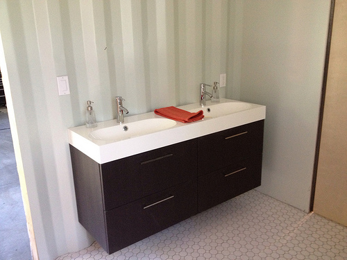 Well, I guess I’ll have to explain a few details about why tiling in a container can pose some minor struggles. Numero Uno: Corrugated walls. Since the walls in the bathroom are corrugated (layman term: wavy), the floor tile had to be cut to fit. I chose a mosaic type tile, with small pieces, bringing us to struggle dos: Tile cutting. Have you ever tried cutting small, I mean really small tile? I haven’t either, I left that up to the boys. But I hear its a beast.